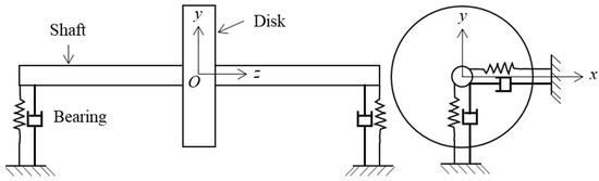The shaft is supported by two bearings at the ends; the bearings are linearized, ideally with stiffness and damping. The support and/or foundation are assumed to be rigid. The dynamic response of the shaft-disk system is represented by a fixed coordinate system at the center of the disk. The system is characterized in terms of transverse displacements, and the vibration along the axis of the shaft is ignored. For the isotropic properties of the bearings at the two ends, and the disk mounted at the center of the shaft, the dynamics of the system in Figure 3 can be defined by a time-dependent equation, as follows: