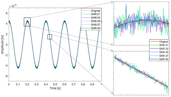 where S is the original signal without noise and Z refers to the random noise having normal/Gaussian distribution with zero mean and μ variance. Snoise is the output signal contaminated with noise. Additional mathematical details of adding white Gaussian noise can be found in the MATLAB documentation and the published literature, as shown in the references [56,57,58]. The decision to use a range of SNR from 31 to 40 was made after looking at the effect of different SNR values on the original signals obtained from simulations. The effect of different values of SNR on the original signal of 9 g unbalance at 300 rpm is shown in Figure 4.