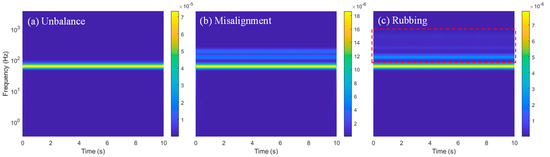 The scalograms of the three defects have distinct characteristics in the time-frequency domain. In general, the presence of unbalance, misalignment, and rubbing in a rotating system are characterized by the presence of distinct frequency spectra at 1X (speed of rotation) [68], frequency spectra at 1X and the integral multiples thereof (2X, 3X), and frequency spectra at 1X and its sub- and super-harmonics depending on the speed of rotation [69,70], respectively. The general characteristics of unbalance, misalignment, and rubbing can be observed in the scalograms in Figure 5, where the presence of unbalance, misalignment, and rubbing are shown by a distinct frequency component at the speed of rotation, the speed of rotation and its integral multiples, and by super harmonics (dashed red rectangle), respectively. In addition, note that the y-axis is a logarithmic scale.