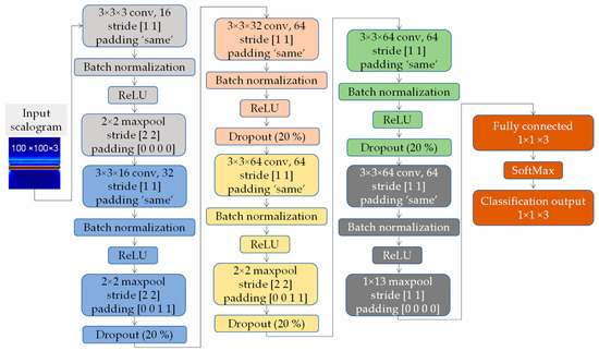 The scalograms of the source data from the simulation were used to train, validate, and test a convolutional neural network (CNN). Figure 6 depicts the detailed architecture of the CNN used in the current work.