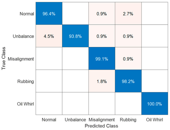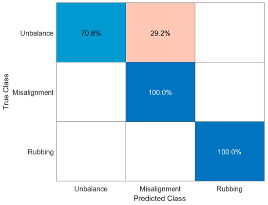 As shown in Figure 8, the pretrained network successfully identified the presence of misalignment and rubbing with 100% accuracy; however, it confused 29.2% instances (321 observations) of unbalance with misalignment. The reason for the confusion between unbalance and misalignment is that the misalignment model in Equation (4) only simulates parallel misalignment along the y-axis, resulting in misaligned response characteristics along the y-axis and unbalance response characteristics along the x-axis. For lower values of added unbalance, the unbalance response from the misalignment model along the x-axis and the actual added unbalance will be confused. Thus, 29.2% instances of unbalance were confused with misalignment.