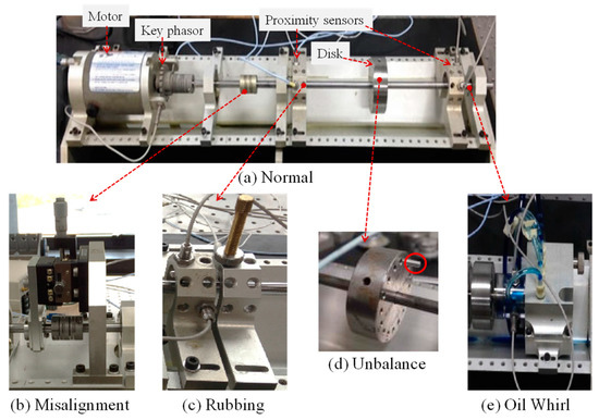 Two experimental data sets were employed to validate the effectiveness of the proposed approach. The first experimental vibration data for different health states of the shaft-disk system was obtained from an RK4 rotor kit, a product of GE Bently Nevada (1631 Bently Parkway South, Minden, Nevada USA 89423). The vibration signals were obtained via proximity sensors for the following health states: normal (residual unbalance), unbalance, rubbing, misalignment, and oil whirl. The experimental configuration of the different health states of the rotor system is shown in Figure 9.