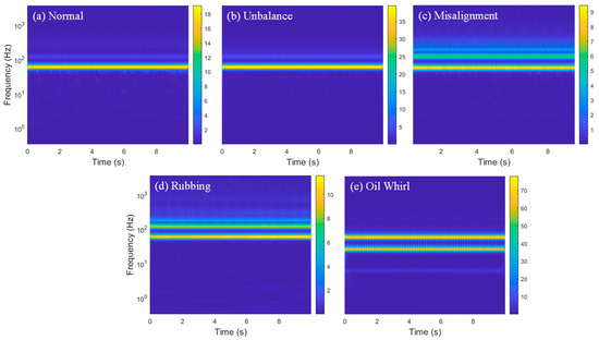 The CWT filter bank designed for the simulation data was used to transform the vibration signals from the RK4 rotor kit for all health states to scalograms without any preprocessing. We aimed to gain insight into the characteristics of different defects and compare the results with the outcomes of the simple simulations. Figure 10 depicts sample scalograms of the experimental data for the different health states.