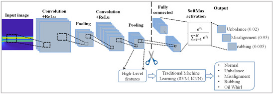 In transfer learning, a model developed and trained for one task is reused as a starting point for another related task, without expending much time or computational resources [33]. As stated previously, the inner layers of a CNN autonomously extract high-level features from the input images and use those features in the last fully connected and classification layers to distinguish between different classes of input images. In the architecture of a pretrained network, some layers can be eliminated to retrieve the high-level features from layer activation, and those features can be processed with traditional machine learning algorithms, as depicted in Figure 11.