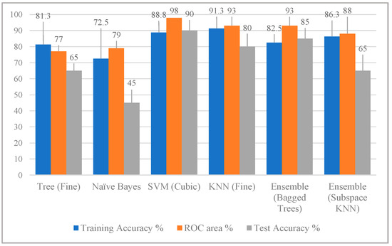 As shown in Figure 12, the minimum and maximum training accuracies were 72.5% and 91.3%, for the naïve Bayes and KNN classifiers, respectively. However, the overall training accuracy could be deceiving, and the model may have overfitted the training data. The matrices of ROC area and prediction results on an independent test set would help to fully explore the behavior of the supervised learning classifiers.