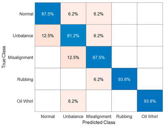 As shown in Figure 14, 25% of instances of misalignment were confused with rubbing and 25% of the instances of rubbing were confused with misalignment. The results of the test confusion matrix are within an acceptable range, as 25% of instances is equivalent to one observation out of four from the 20% test data.