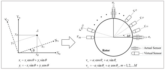 Another option is to employ the concept of virtual sensors around the shaft, as introduced by Jung et al. [75], to artificially augment the data without performing any further experiments. In this work, the concept of virtual sensors is adopted to synthetically augment the experimental data. The main idea of virtual sensors is to obtain synthetic vibration signals from the vibration signals of the actual orthogonal proximity sensors by rotating the cartesian coordinate system with respect to the z-axis, as depicted in Figure 15.