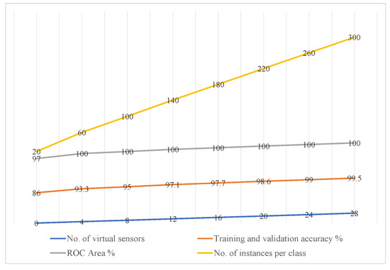 where xVm and yVm are virtual signals along the rotated x and y axes, respectively. The terms ax and ay refer to the actual signals obtained via the proximity sensors along the original x and y axes, respectively, Δθ is the angle of rotation for the coordinate system of virtual signals, and M denotes the number of virtual signals. Owing to symmetry around the shaft, the maximum number of virtual sensors is M = π/Δθ. As shown in a previous paper [75], xVm is equal to yVm+M/2; hence, in this work only xVm was retained from Equation (6) for synthetic data augmentation. To identify the optimum number of virtual sensors for the current task, a parametric study was carried out for different numbers of virtual sensors and the effect was evaluated terms of training/validation accuracy, ROC area, and the number of instances per class as a result of data augmentation, as shown in Figure 16.