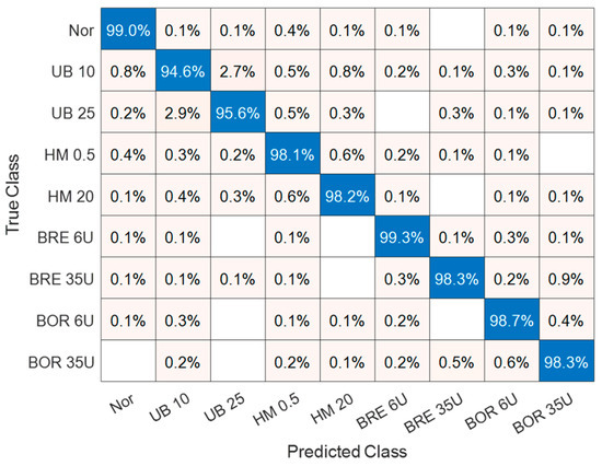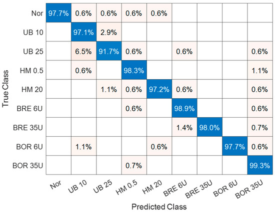 The cubic SVM was trained via 10-fold cross-validation on the synthetically augmented data using 12 virtual sensors. In Figure 17, the higher true positive rate and the lower false positive rate for each class demonstrate the optimum performance of the proposed methodology on the experimental data set. Additionally, note that the per class classification performance increased compared with the results from the data without augmentation in Figure 13. To show that the vibration signals synthesized through virtual sensors did not cause overfitting of the machine learning model, the cubic SVM pretrained on the augmented data (synthesized and measured) was employed to make predictions on the 20% unseen test data. Here, the unseen data describes a data set not seen by the network during the training/validation process. The pretrained model showed a test accuracy of 97.14%, with the confusion matrix shown in Figure 18.