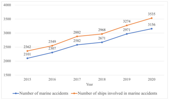 In Korea, an average of 2631 marine accidents have occurred per year over the last six years (Figure 1). Out of 553 fatal accidents in 2020, 126 people were killed or are missing [1]. As the environment changes, including weather and ocean currents, marine accidents involving fishing boats or passenger ships are becoming more common [2]. Because marine accidents usually occur in environments where direct human access is difficult, the risk of death also increases, creating danger for the victim and rescuer alike [3]. To reduce the number of fatalities, a system that can respond to marine accidents under normal circumstances should be established, and first responders should be prepared to use it in an emergency [4,5].