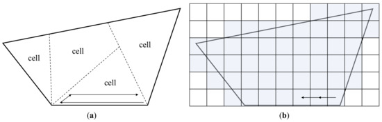 A CPP problem first divides the target area into subareas that need to be covered and then determines the order in which the divided area will be covered. As shown in Figure 2, the two methods for segmenting the region are cellular decomposition and grid-based decomposition [23,24,25]. In Figure 2a, the cellular decomposition method divides the area based on the characteristics of the search area and the UAV’s speed, weight, battery endurance, etc. [26,27,28]. Although the cellular decomposition method is simple to determine the order of cells to cover as it considers the characteristics of the region and the UAV when dividing, owing to the various characteristics, it is difficult to define the decomposition criterion. As shown in Figure 2b, the grid-based decomposition method divides an area into small pieces using a predetermined unit. The grid-based decomposition method divides the region without considering the region’s characteristics or the UAV, making it simple to divide the region but increasing the complexity of planning the coverage path.