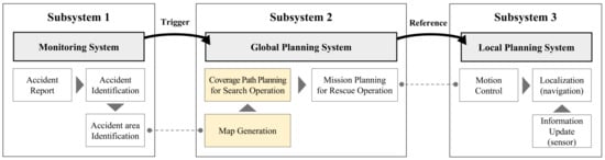 The objective of this study is to enhance the efficiency and completeness of search operations in maritime SAR systems. Figure 3 shows the overall architecture of the SAR system, which consists of a monitoring system (subsystem 1), a global planning system (subsystem 2), and a local planning system (subsystem 3).