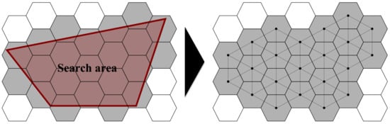Phase 2 transforms the generated hexagonal grid-based map into a graph to obtain input values for path generation. The graph is comprised of nodes centered at each hexagonal grid cell and edges connecting each grid and adjacent grids. The grid-decomposed area is converted to graph form, as shown in Figure 5, and all grids corresponding to the search area are covered. In this study, we set up a MILP model that creates a search path for multiple heterogeneous UAVs that covers all the nodes in the shortest time.