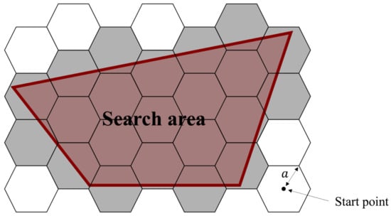The search area in this study is divided into hexagonal grid cells, assuming each UAV moves through the grid’s center. Hexagonal grid-based decomposition is used accordingly from the point where the UAV departs. The size of the hexagon is the image size (a) as determined by the camera quality of the UAV (see Figure 6). Covered and uncovered grids are defined in the divided search area and used as input values to create the search path in phase 2.