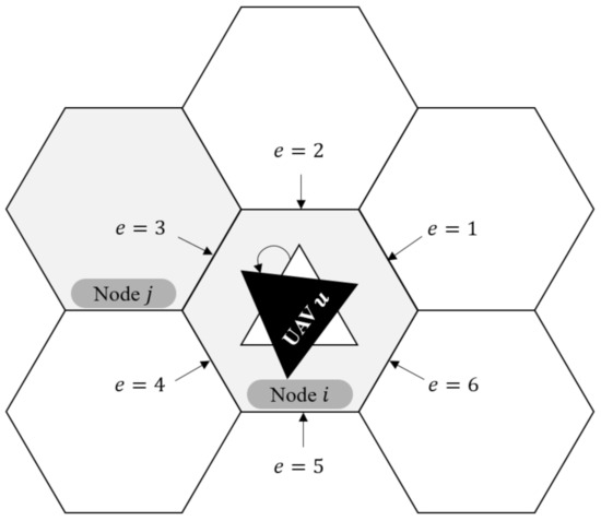 | E | Set of indices with the following values: 1 () if a UAV is heading toward to the hexagonal side () of the node; 7 if it passed the starting node; 8 if it passed the ending node |