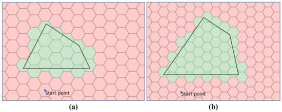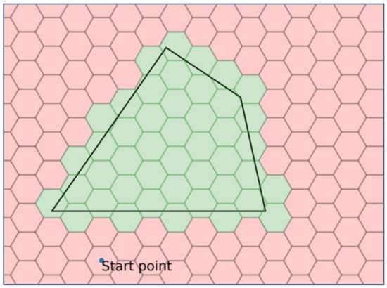 We conducted numerical experiments to verify and analyze the methodology presented in this study. The hexagonal grid map generated in phase 1 is defined as an input value of the mathematical model presented in Section 2.2. Figure 8 is one of the target search areas used in the experiments, and the grid cells marked in green are used as the input value.