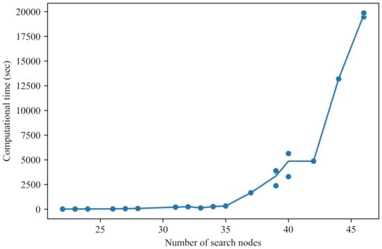Figure 10 shows the relationship between the time required to calculate the optimal solution using the commercial solver and the number of search nodes. When the number of search nodes was less than 27, an optimal solution can be found within a minute based on the instance used in this experiment. When the number of search nodes reaches 40, the commercial solver takes more than an hour to find the optimal solution. Figure 10 shows that as the size of the search area grows, the computational time grows exponentially, indicating an exponential growth in the computational complexity.