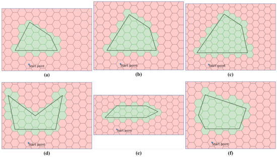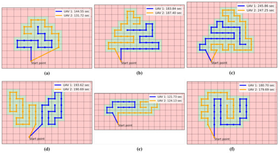 The optimal search path derived from the mathematical model presented in Section 2 is discussed in this section. As shown in Figure 11, we used various search areas to test the proposed model in this experiment. Figure 11a–c are instances used in Section 3.2, and the shapes of the search areas are similar but the sizes are different. Figure 11d–f are instances that have different irregularly shaped search areas.