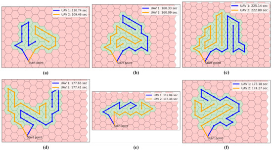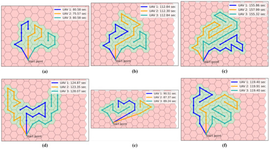 Compared to the results in Figure 13, on the hexagonal grid map in Figure 12, the search times of the served UAVs are reduced for all test instances. The search completion times on the hexagonal grid map are on average 10.59% lower than those on the square grid map. For instance (a), the worst case, the reduction reaches 23.39%. Furthermore, on the hexagonal grid map, the average difference between the search times of the served UAVs is 1.30 seconds, compared with an average difference of 4.02 seconds on the square grid map. Thus, the reduction is 67.7%. All these results are intuitively reasonable because the hexagonal grid decomposition allows more movable nodes for the served UAVs and thus creates relatively flexible paths.