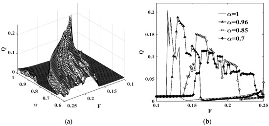 In order to further discuss the effect of on the VR, the response amplitude versus for is depicted in Figure 2a. For a certain range of , although the response amplitude is not a strictly monotonic increasing function of , in general, with the increase of , the response amplitude can be optimized under the appropriate high-frequency force. However, when the value of is fixed, the function of versus shows different monotonic characteristics, as shown in Figure 2b. For , the curve of response amplitude is approximately a straight line, which indicates that VR does not occur with the change of , while for or , the response amplitude is a nonlinear function of , and the low-frequency signal can be significantly enhanced by selecting an appropriate fractional-order compared with the integer-order system.