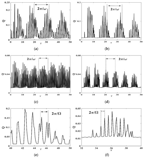 For the fractional-order FitzHugh–Nagumo neuron with time delay, the numerical result of functional curves of the response amplitude versus can be obtained by combining Equation (8) with Equation (9). The response amplitude versus time delay in the fractional-order FHN neuron excited by two frequency signals is given in Figure 3. Figure 3e,f are partial, enlarged views of Figure 3a,d, respectively. From Figure 3a–d, it is seen that multiple resonance occurs in the neuron with the increase of the time-delay parameter. Therefore, the response amplitude can reach the maximum by selecting appropriate time-delay parameters, and the response amplitude can be greatly amplified compared with the neuron without time delay. Another notable phenomenon is that the response amplitude is periodic with the change of . From Figure 3a–d, it is clear that that the period of response amplitude is , while Figure 3e,f shows that the response amplitude varies with another period of . Therefore, the response amplitude in the fractional-order FHN neuron with time-delay feedback presents two different periods, namely fast period and slow period , which exactly correspond to the period of high-frequency signal and low-frequency signal. Utilizing the periodicity of response amplitude and selecting appropriate time-delay parameters are helpful to realizing the effective control of the fractional-order FHN neuron. The only regret is that the parameters involved in the system are difficult to be optimized quickly to satisfy the requirement of resonance, which is consistent with the conclusion in Ref. [30].