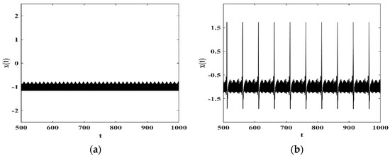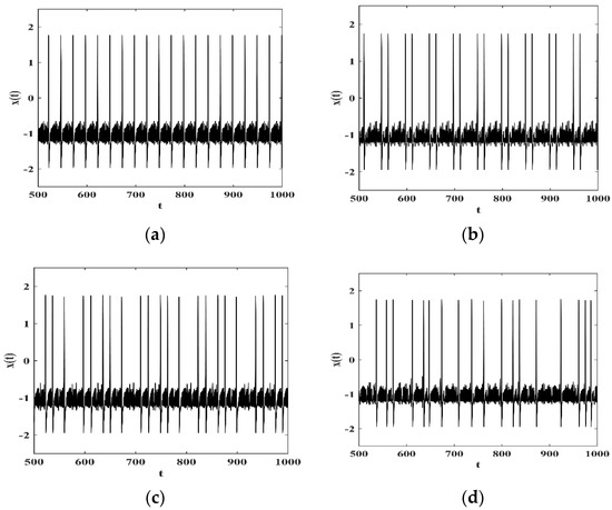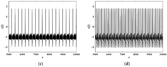 In order to intuitively depict the effect of the fractional-order on the dynamical behavior of the FHN neuron, the evolution of the membrane potential is given in Figure 5. From Figure 5a, when , the neuron is in the quiescent state. As can be seen from Figure 5b,c, when and , the firing pattern of the neuron is period 1 bursting. Obviously, their interspike intervals are different, which are four times and two times , respectively. In Figure 5a, when , the discharge rhythm of the FHN neuron alternates between period 1 and period 2. From Figure 5a–d, it is found that the fractional-order FHN neuron is more active with the increase of , which is consistent with that revealed in Figure 4.