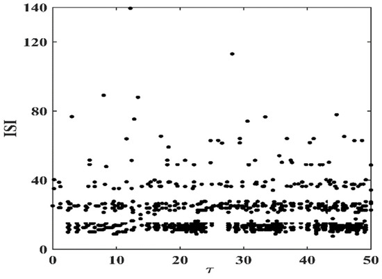 In this subsection, the dynamical behavior of the fractional-order FHN neuron without time-delay feedback is studied. Figure 4 shows the bifurcation diagram of interspike interval (ISI) of the neuron versus the fractional-order , where . From Figure 4, when is small, it can be seen that the fractional-order FHN neuron does not fire, and when the is relatively large, various periodic and irregular firing patterns appear in the neuron. It can be found that the fractional-order FHN neuron displays complex dynamics by adjusting a single parameter , which is also observed in other neurons [31,32].