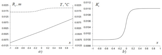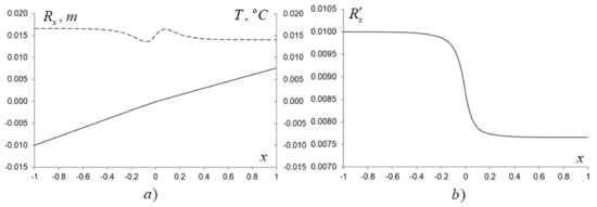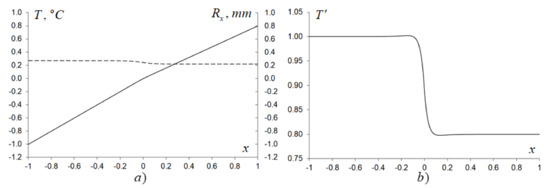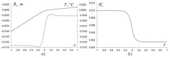 Consider a solution for a two-phase fragment with parameters when thermal loading occurs. In this case, the solution is represented by relations (25)–(31). As an example, Figure 7 shows the variant of calculating the Eshelby problem for the coupled gradient thermoelasticity and stationary thermal conductivity with the same parameters as was considered early in Figure 1, only at , with a given temperature gradient and at the left end of the bar.