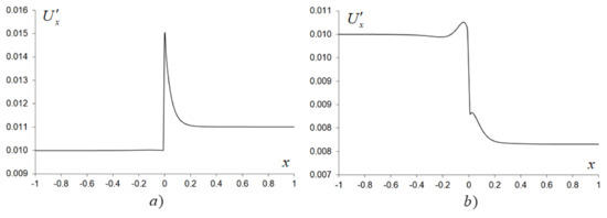 Figure 1 and Figure 2 show that, on average, the displacement and temperature fields change insignificantly over the fragment under consideration, while the deformations change significantly in a qualitative sense. The change of parameter changes insignificantly the local temperature field, but changes significantly the local temperature flux fields (Figure 2a). Note that the gradient theory ensures the continuity of total deformations, but the “semiclassical” part of the deformations breaks at the point of phase contact for all connectivity parameters (see Figure 3).
