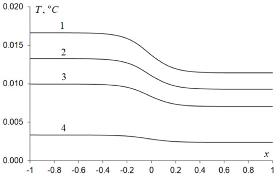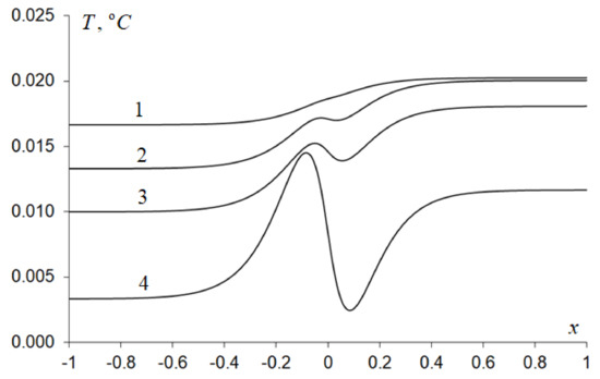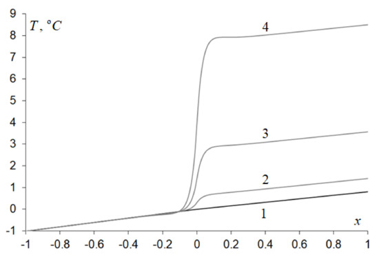 Distribution of temperature with various and ; 1—; 2—; 3—; 4—.