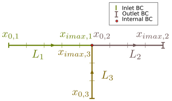 When considering junctions such as the one represented in Figure 1, internal boundary conditions are needed. In the present work, uniform water surface level together with discharge continuity at the junction is assumed [40]: