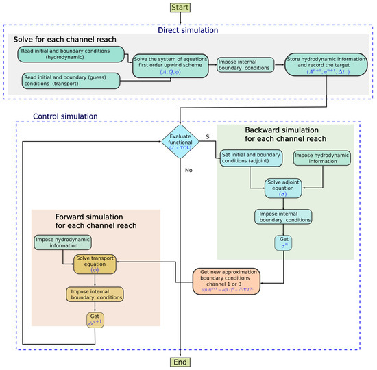 Figure 3 illustrates the flowchart followed to reconstruct the information of the solute boundary condition. This process is summarized in two fundamental stages: the so-called flow simulation and the control simulation. In the flow simulation, the flow equations are solved using (5) with the known initial and boundary conditions, while the transport equation is computed with an estimated boundary condition (initial guess, generally 0) using (6). All the hydrodynamic information necessary for the next stage is stored during this process.