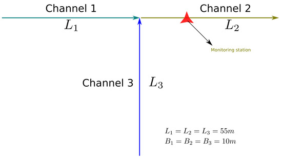In this scenario, we consider a 90° junction of three 10 m wide rectangular flat and frictionless channels of lengths , and and widths , and as shown in Figure 4. The initial conditions are