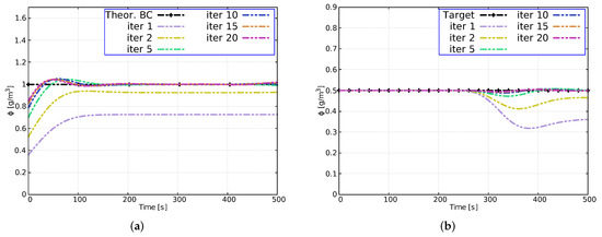 The time evolution of the solute concentration both at the inlet of channel 1 and at the target location in channel 2 obtained with CFL = 1, m and are shown in Figure 5. The numerical solution with the proposed scheme is plotted for iterations 1, 2, 5, 10, 15 and 20 (colored lines) for both the boundary conditions (a) and the target (b). The numerical solution of the last iteration converges to the theoretical solution (black line) with an acceptable accuracy. Small differences show up at the beginning of the simulation () for the boundary reconstruction. This behavior has already been reported and analyzed in the literature [27] and is attributed to the numerical diffusion. The target is however successfully achieved at iteration 20.