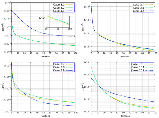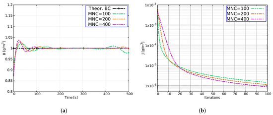 This test case has been repeated to evaluate the influence of the mesh size using the following number of cells (MNC): 100, 200 and 400. The results of both the reconstruction of the boundary condition in the last iteration and the evolution of the objective functional are plotted in Figure 6. Particularly, Figure 6a shows the variations that occur at the beginning of the simulation. They can be attributed to the numerical diffusion as well that tends to decrease as the mesh number of cells (MNC) increases.
