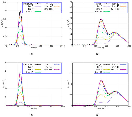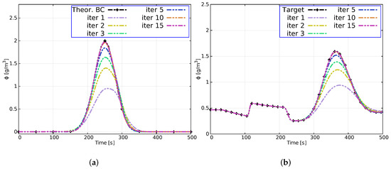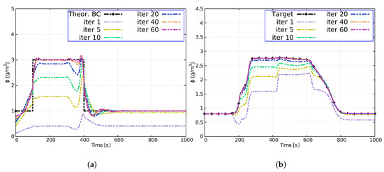 Figure 10 shows the numerical solutions at some iterations for both the reconstruction of the boundary condition and the target. Figure 10a shows small variations in the last iteration that can be attributed to the considered solute pulse shape, differences that are totally reduced when the signal to be reconstructed is smoother (Case 4) also observed in [27]. Figure 10b shows the target reached in only 60 iterations with satisfactory results.