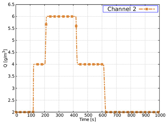 On the other hand, the flow boundary conditions for channels 1 and 3 are a transient configuration defined by (21) using for channel 1 and , for channel 3. The theoretical solute upstream boundary conditions to be reconstructed are highlighted in grey in Table 3 and are also defined by Equation (22). The remaining parameters and the decay rates are defined in Table 3.