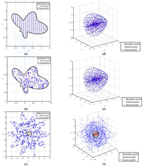 In type B, the boundary shapes in two and three dimensions are exactly the same as those in type A. However, the source points are regarded as the fictitious centers, which are randomly scattered within the domain [24], as depicted in Figure 1b,e.