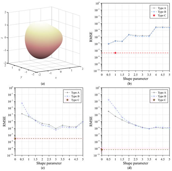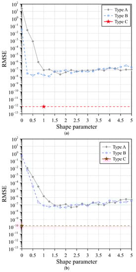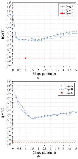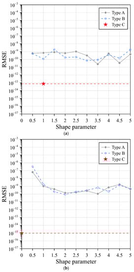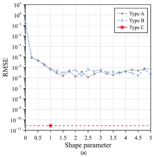 The Gaussian RBF with three different collocation types with various shape parameters is first investigated, as shown in Figure 2a. From Figure 2a, it appears that the simplified Gaussian RBF without the shape parameter utilizing the exterior fictitious sources of type C provides the most accurate solution. The results obtained demonstrate that the RMSE of the simplified Gaussian RBF without a shape parameter for type C is in the order of 10−12. It seems that the simplified Gaussian RBFs utilizing the exterior fictitious sources of type C have the best accuracy among those Gaussian RBFs for type A and type B even when different values of the shape parameter are considered.
