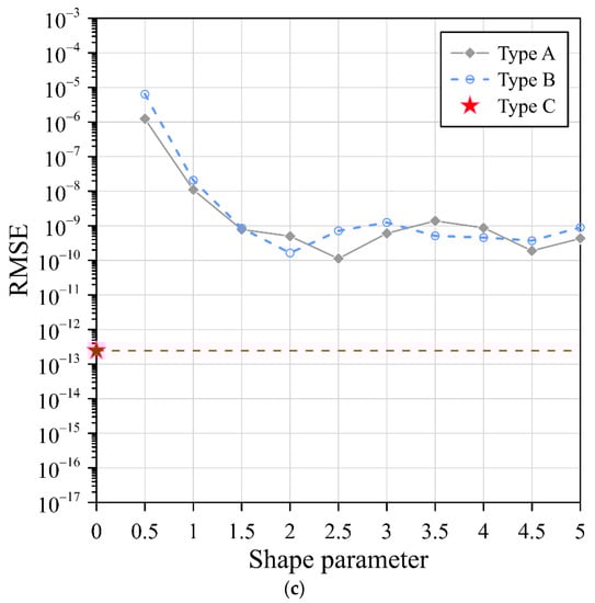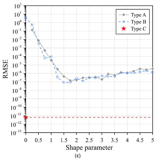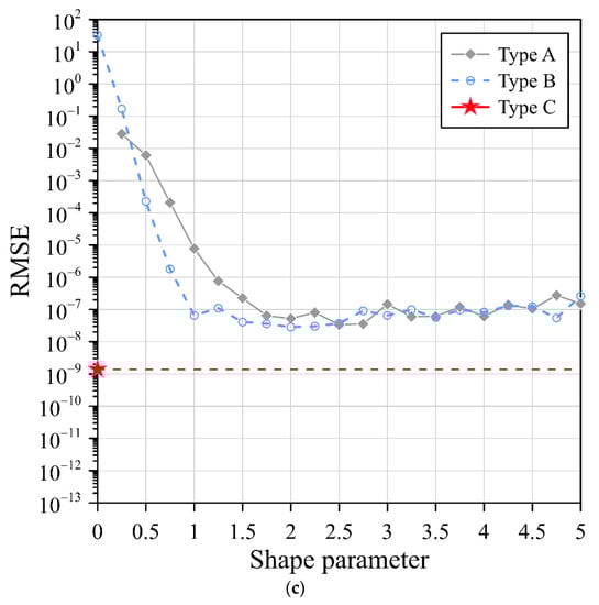 Figure 9a demonstrates the RMSE of the Gaussian RBF for the three collocation types. From Figure 9a, the RMSE of the Gaussian RBF in type A and type B was in the order of 10−1 to 10−6 as the shape parameter ranged from 0.5 to 5. However, the RMSE of the Gaussian RBF without a shape parameter in type C reached the order of 10–11. The MQ and IMQ RBFs were analyzed by adopting the same perspective. The RMSE of the MQ and IMQ RBFs for the three collocation types are illustrated in Figure 9b,c, respectively. Similar to the results shown in Figure 9a, we also found that the MQ and IMQ RBFs without the shape parameter for type C reached the order of 10–9 and 10–8, respectively.