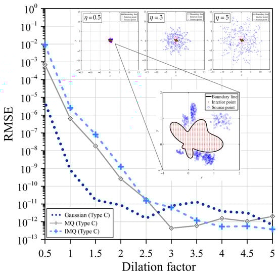 In this example, the values of the dilation factor ranged from 0.5 to 5. A plot of the RMSE versus the dilation factor is depicted in Figure 3. From Figure 3, the RMSE of the MQ, IMQ, and Gaussian RBFs utilizing the exterior fictitious sources for type C fluctuates between 10–11 and 10–13 while the dilation factor ranges from 2.5 to 5. The results obtained show that the dilation factor has low sensitivity regarding the numerical accuracy while the dilation factor is greater than 2.5. Accordingly, the following numerical implementations of type C were solved using .