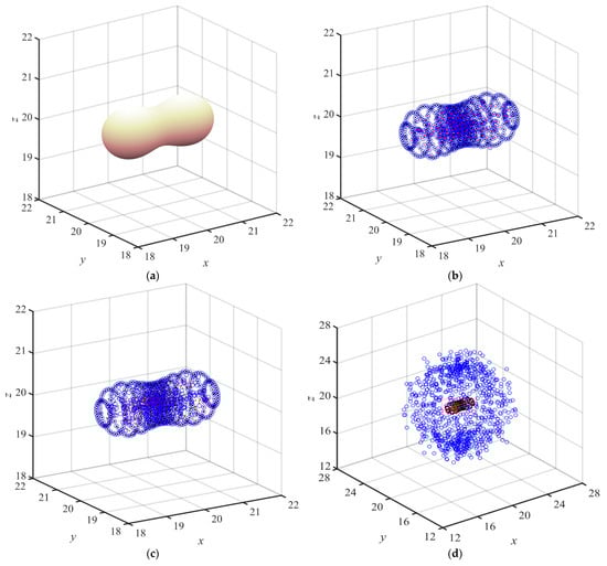 A three-dimensional problem is enclosed by a sophisticated irregular domain boundary, as shown in Figure 4a. The governing equation in three dimensions is expressed as Equation (1), where , , and are 0. The object boundary is given by the spherical parametric equation as follows: