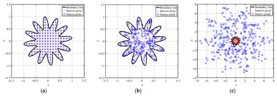The fictitious sources are uniformly scattered within the two-dimensional amoeba-like domain, as depicted in Figure 1a. The interior, sources, and boundary points are placed such that the positions of the interior and fictitious sources are identical.