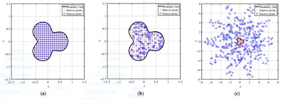 Three RBFs, including the Gaussian, MQ, and IMQ, are were in the collocation method. Three collocation types for locating the sources, as illustrated in Figure 8, were considered in the above RBFs to solve this problem. There were 355 source points, 210 interior points, and 200 boundary points. In type A, the fictitious sources are uniformly scattered within the domain, as depicted in Figure 8a. The interior, sources, and boundary points are placed such that the positions of the interior and fictitious sources are identical. In type B, the fictitious sources are randomly scattered within the domain, as depicted in Figure 8b. In type C, the fictitious sources are randomly scattered outside the closure of the domain, as depicted in Figure 8c. The collocation of the exterior fictitious sources is defined by the following parametric equations: