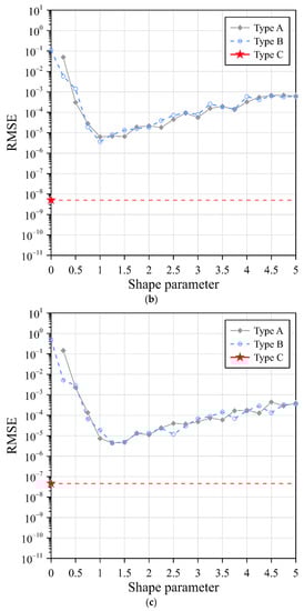 RMSEs of RBFs with three different collocation types: (a) Gaussian RBF, (b) MQ RBF, and (c) IMQ RBF.