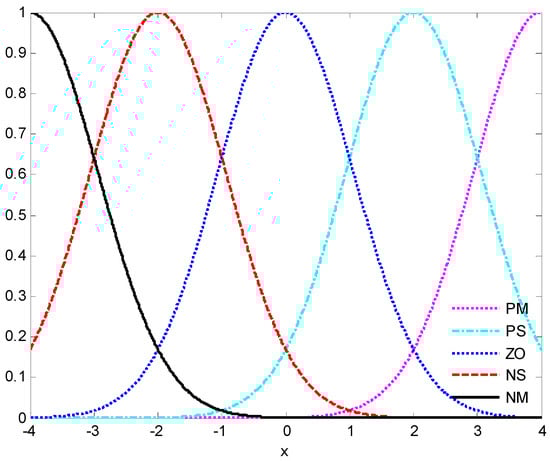 In the simulation analysis, the fuzzy sets are given as , , , , , , , , , , , , , and , which are specified in the interval for variables , and , respectively. In addition, , , , , and represent negative middle, negative small, zero, positive small, and positive middle with the center points being pointed as −4, −2, 0, 2, and 4, respectively. Accordingly, the fuzzy membership functions are denoted as , , , and , , respectively. The curves of fuzzy membership functions are shown in Figure 1. Take design parameters and initial conditions as: , , , , , , , , , , , , , , , , .