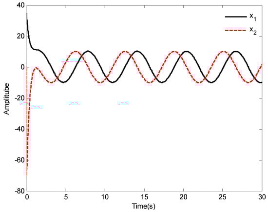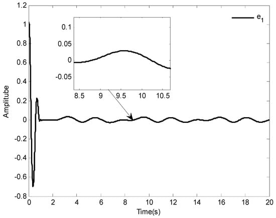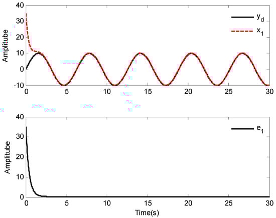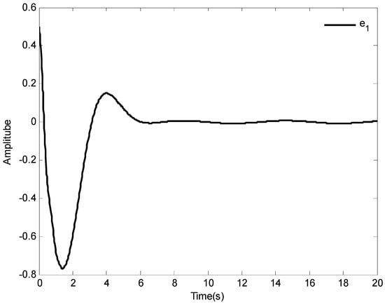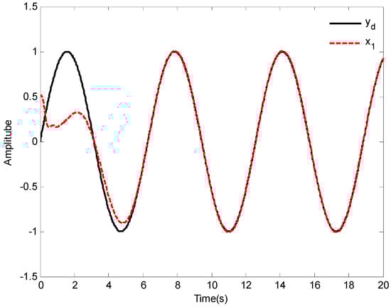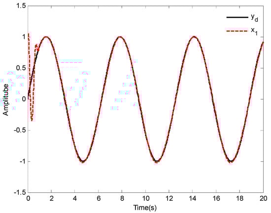 In addition, the initial states of system (64) are given as and , the desired reference signal is given as , the simulation , and the other models are the same as []. Based the proposed control law of this paper, the simulation results are shown in Figure 15, Figure 16 and Figure 17.