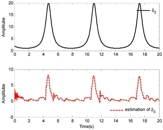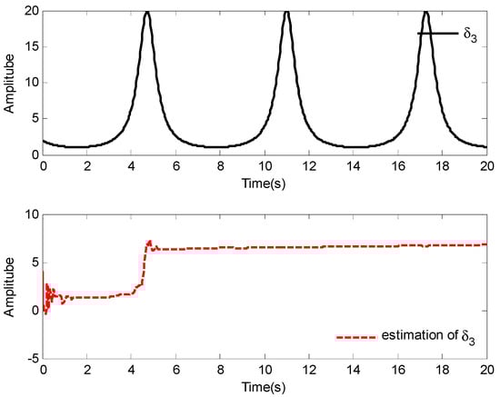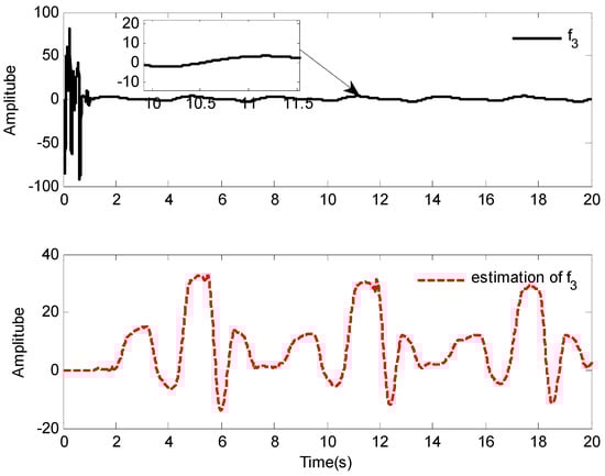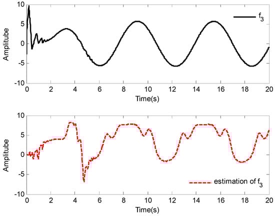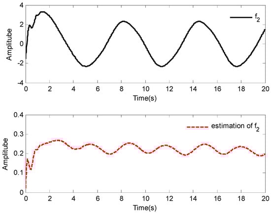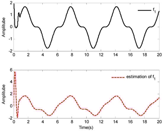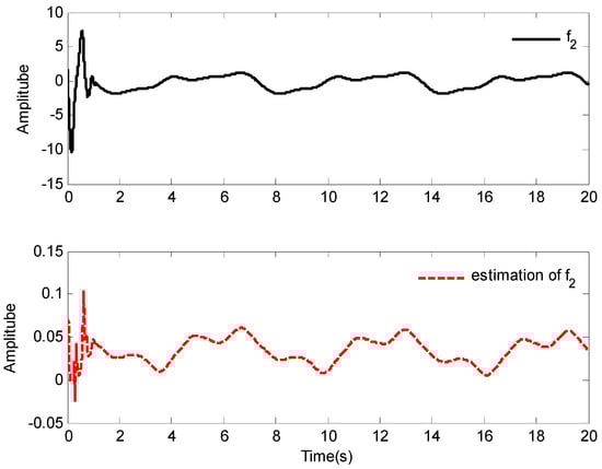 The simulation results of Case 1 are shown in Figure 2, Figure 3, Figure 4, Figure 5, Figure 6, Figure 7, Figure 8 and Figure 9. It is found from Figure 2 and Figure 3 that the excellent tracking performance can be achieved after a short transit process. Furthermore, the curves of nonlinear functions , , and their estimates , , are shown in Figure 4, Figure 5 and Figure 6, respectively. Figure 7 gives the curves of and its estimate , and the control input is displayed in Figure 8. Because of the initial values are randomly selected, the amplitude of the estimated value of functions , , and are greatly reduced compared with the actual value, which also shows that the control laws designed in this paper are effective from another point of view.