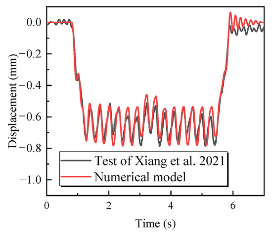 In the work of Xiang et al. [22], the dynamic performance of a railway simply supported bridge was tested on site. In order to verify the accuracy of the numerical model in this paper, the field test results were compared with the numerical calculation results, as shown in Figure 2. It can be found that the peak value and trend calculated by the numerical model are close to the field test results, which shows the reliability of the numerical calculation results.