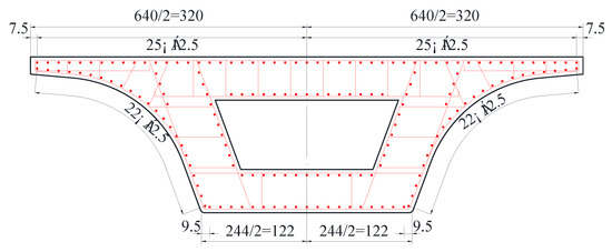 The research object is an urban rail viaduct in Zhengzhou, China, and the viaduct is a reinforced concrete structure with a box type section, as shown in Figure 4. The bridge span includes 30 m and 25 m, the strength grade of the bridge concrete is C55, the reinforcement is HRB400 with diameters of 12 mm and 16 mm, the concrete cover thickness is 35 mm, and the carbonation environmental action grade is T2. The second dead load is 35.05 kN/m, and the concrete volume weight is 25 kN/m3. The bridge is simply supported, and the support of the girder is ideally hinged. The detail parameters of viaduct are shown in Table 1. The influence of the axial stiffness of the bridge is included in the FE model, and its axial stiffness is mainly related to the cross-sectional area and elastic modulus. It should be noted that the cross-sectional area and elastic modulus here adopt the cross-sectional area A and elastic modulus of the girder Ec. The vehicle is a six-car metro vehicle. The vehicle’s specifications are listed in Table 2, where dv signifies the length of one carriage.